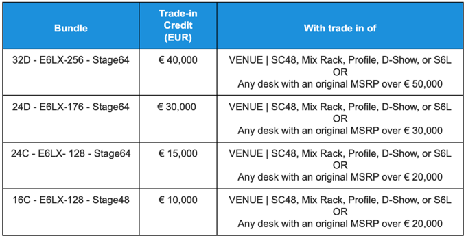 Eligible Trade-Ins: Legacy VENUE systems (SC48, Profile, D-Show, Mix Rack, 1st-gen S6L) or third-party consoles with original MSRP above specified thresholds